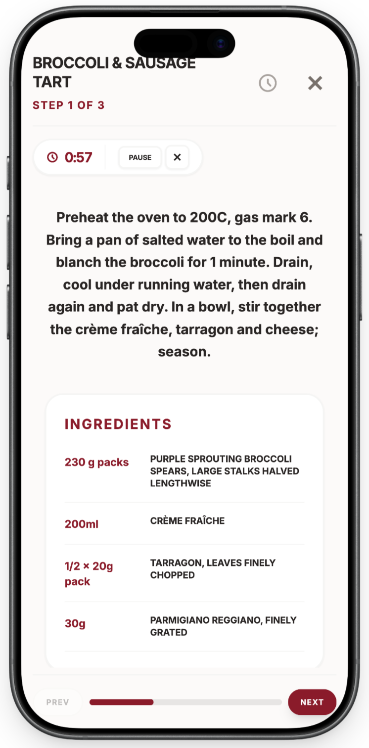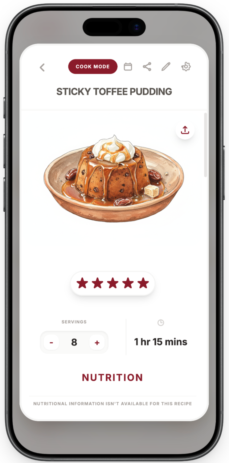 When you are ready to cook, open a recipe and tap "Cook Mode". Our AI will break down the instructions into easy, step-by-step slides so you don't lose your place while your hands are covered in flour, and don’t have to keep scrolling between the ingredients and method steps!